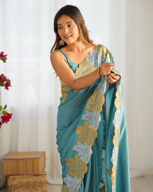 Sky Blue Shimmer Silk Sequins Embroidery Work With Cut Work Border Saree With Blouse Piece