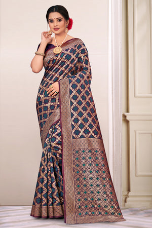 • Navy Blue Zari Woven Banarasi Cotton Saree