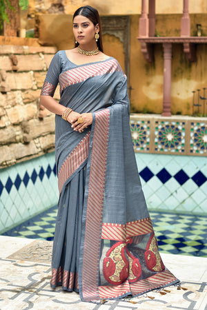 • Pewter Grey Dola Silk Saree