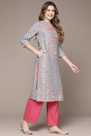 • Women Grey Ethnic Motifs Embroidered Kurta with Trousers