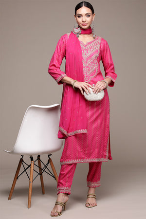 • Women Fuchsia Kurta with Trousers With Dupatta