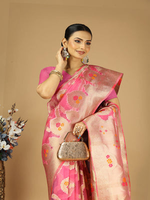 The beautiful features of the saree include gold work, compact weaving, figures with small details, metallic visual effects, pallus, jal, and Meenakari work.