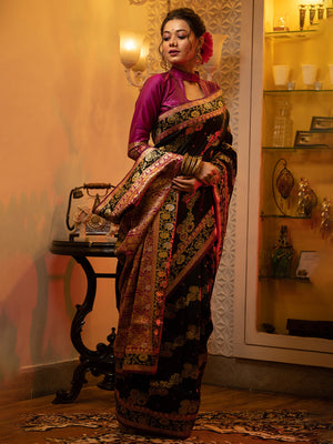 Black Fendy Satin Two Tone Sequins Hand Work Lace Border Saree With Blouse Piece