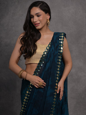 Blue Crepe Georgette Gold Foil Embellished Printed Saree With Blouse Piece