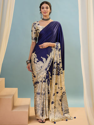 Blue Pure Jacquard Fabrics With Sona Chandi Pure Zari Work Saree With Blouse Piece