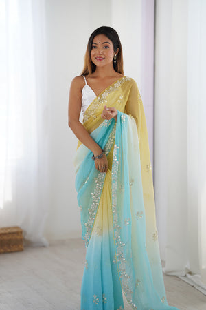Sky Blue Chiffon Shaded Crush Sequins And Moti And Cutdana Work Saree With Blouse Piece