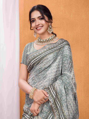 Light Green Silk Chiffon Viscose Border Floral Printed Saree Saree With Blouse Piece