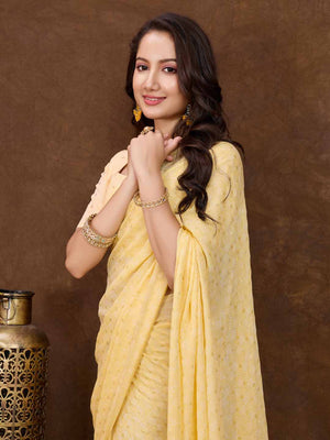 Yellow Crepe Georgette Gold Foil Embellished Printed Saree With Blouse Piece