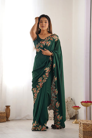 Green Vichitra Silk Sequins Embroidery Work With Cut Work Border Saree With Blouse Piece
