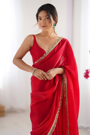 Red Fendy Satin Two Tone Sequins Hand Work Lace Border Saree With Blouse Piece