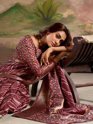 Deep Wine Malai Silk Printed Saree With Zari Floral Border And Blouse Piece