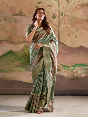 Green Soft Dola Silk With Foil Print & Dusty Colour Matching Saree With Blouse Piece