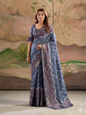 Dark Drey Malai Silk Printed Saree With Zari Floral Border And Blouse Piece