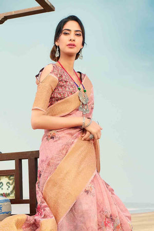 • Crepe Pink Digital Printed Linen Blend Saree
