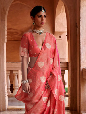 Orange Organza Khadi With Weaving Silk Saree With Zhallar Saree With Blouse Piece