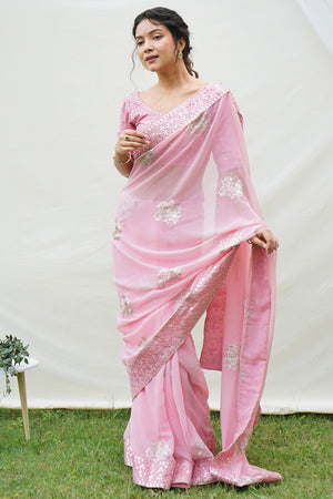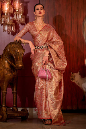 • Mandy Pink & Orange Banarasi Silk Saree With Blouse Piece