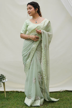 • Moss Green & Blue Silk Saree With Blouse Piece