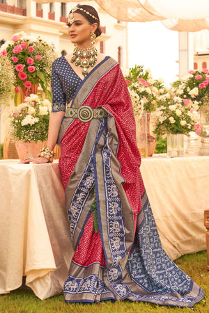 • Crimson Red & Blue Silk Saree With Blouse Piece
