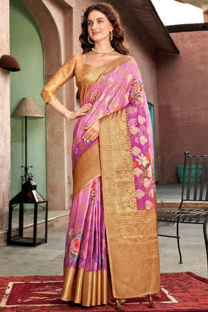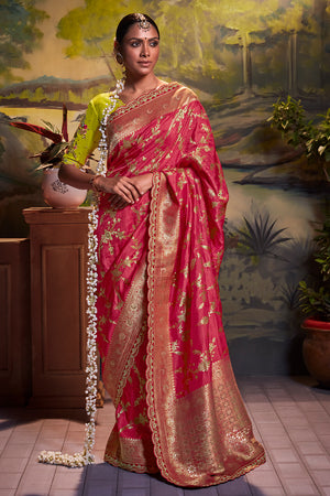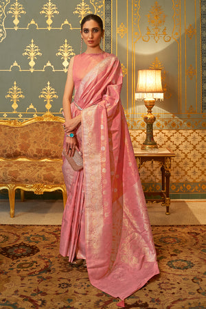 These sarees are known for their intricate designs and heavy border work. They come in a range of pink shades and are perfect for the bride who wants to make a statement.