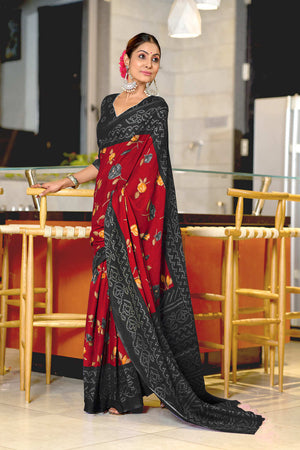 Balck And Red Pure Mulmul Cotton Flower Print Sarees Saree With Blouse Piece