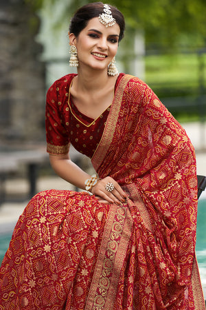 However, your decision to buy a red saree is an incomplete one. This is because you have only selected the colour of the saree you want. You also have to decide what type of saree you want to get. The good news is, that almost every classic and modern weaving and design technique for making sarees is great for bringing out the grace of the red colour.