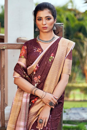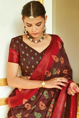 Burgundy Red Banarasi Raw Silk Fusion Saree