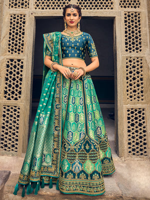 • Green And Pink Banarasi Silk Lehenga