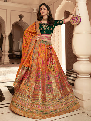 • Orange And Green Banarasi Silk Lehenga