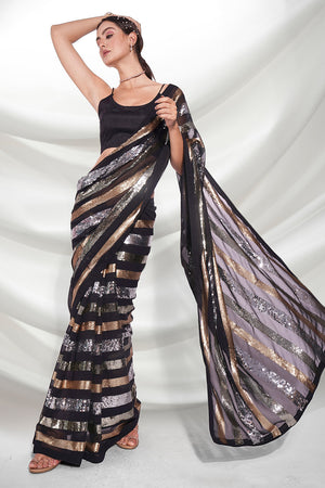 Black Vichitra Silk Sequins Embroidery Work With Cut Work Border Saree With Blouse Piece