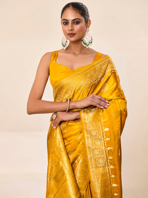 The brocade of a Banarasi silk saree is the result of delicate and skilful work done using gold and The gold work details add beauty to the saree making it stand out. Banarasi silk sarees boast a fusion of richness and classiness, making them a truly unique piece of attire.