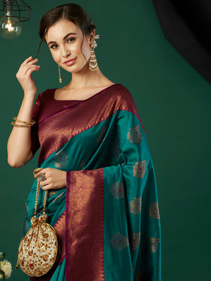 A Kanjivaram saree has royalty and wealth written all over it. The contrasting borders and temple prints make these sarees one of a kind while also showcasing the beauty of the village of Kanchipuram. The body and the border are woven separately and then interlocked at the end of the production process. This unique method of making these sarees makes them special and contribute to their ever-popular beauty.