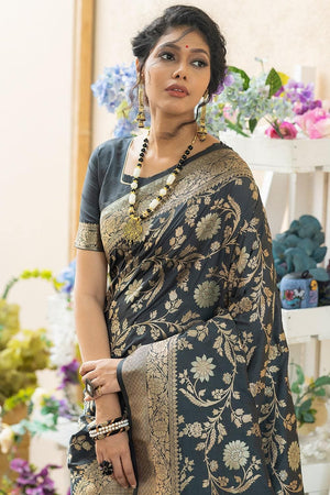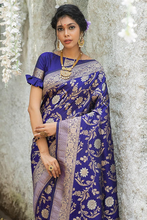 • Ocean Blue Zari Butta Work Banarasi Saree