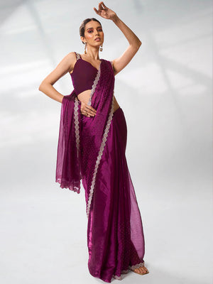 • Burgundy Organza Party Wear Saree With Blouse Piece