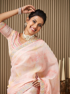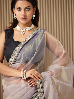 • Lavender Floral Printed Embellished Organza Saree With Blouse Piece