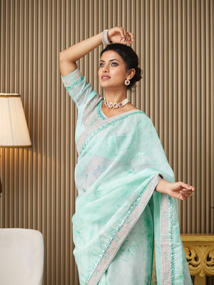 • Turquoise Blue Floral Printed Embellished Organza Saree With Blouse Piece