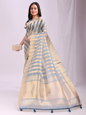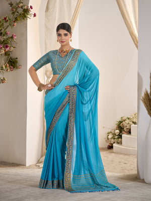 • Turquoise Blue Organza Embellished Saree With Blouse Piece