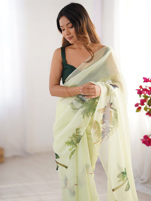 • Turquoise Blue Floral Printed Organza Saree With Blouse Piece
