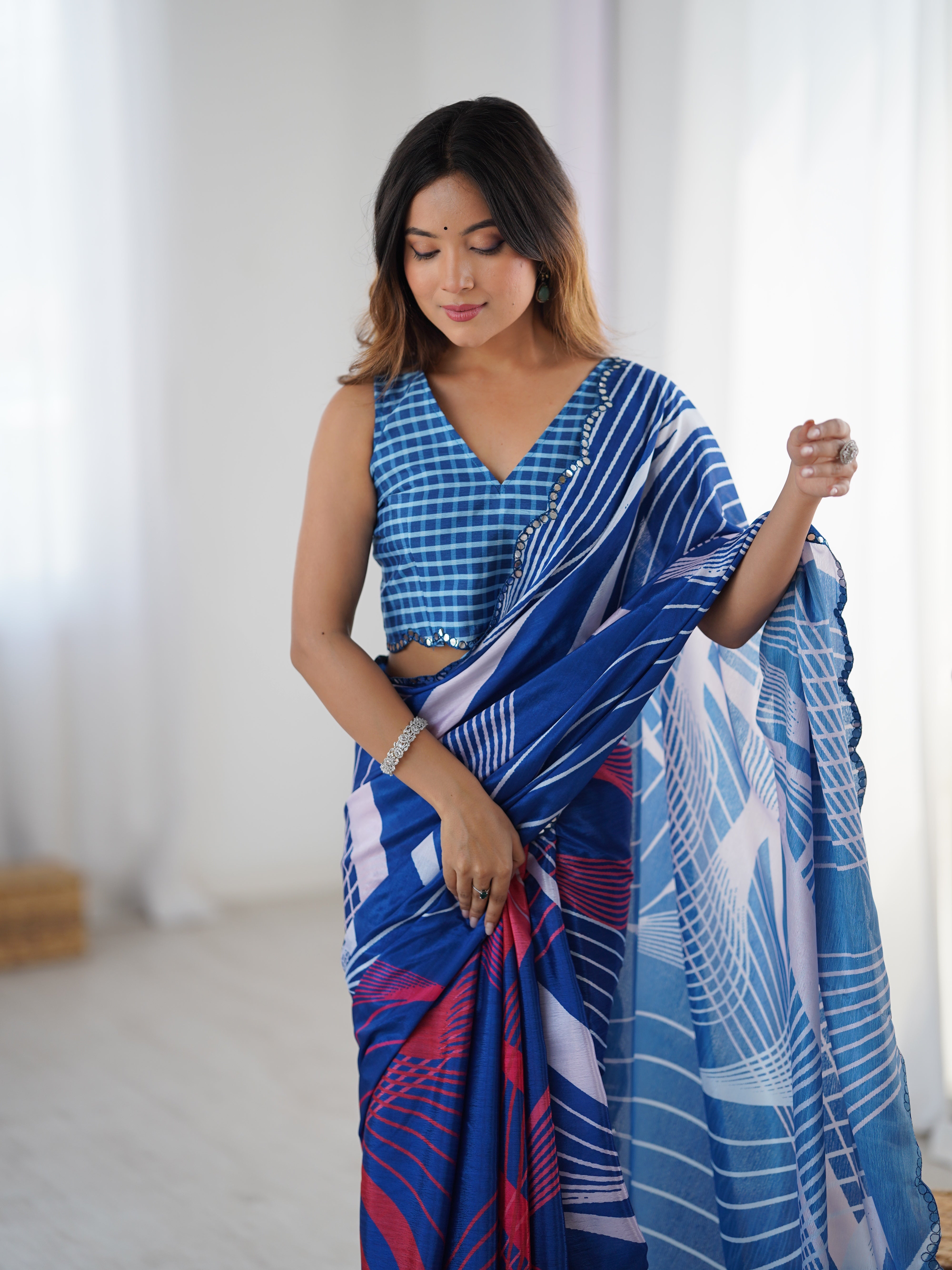 Blue Chinon Digital Printed Designer Saree With Blouse 14601