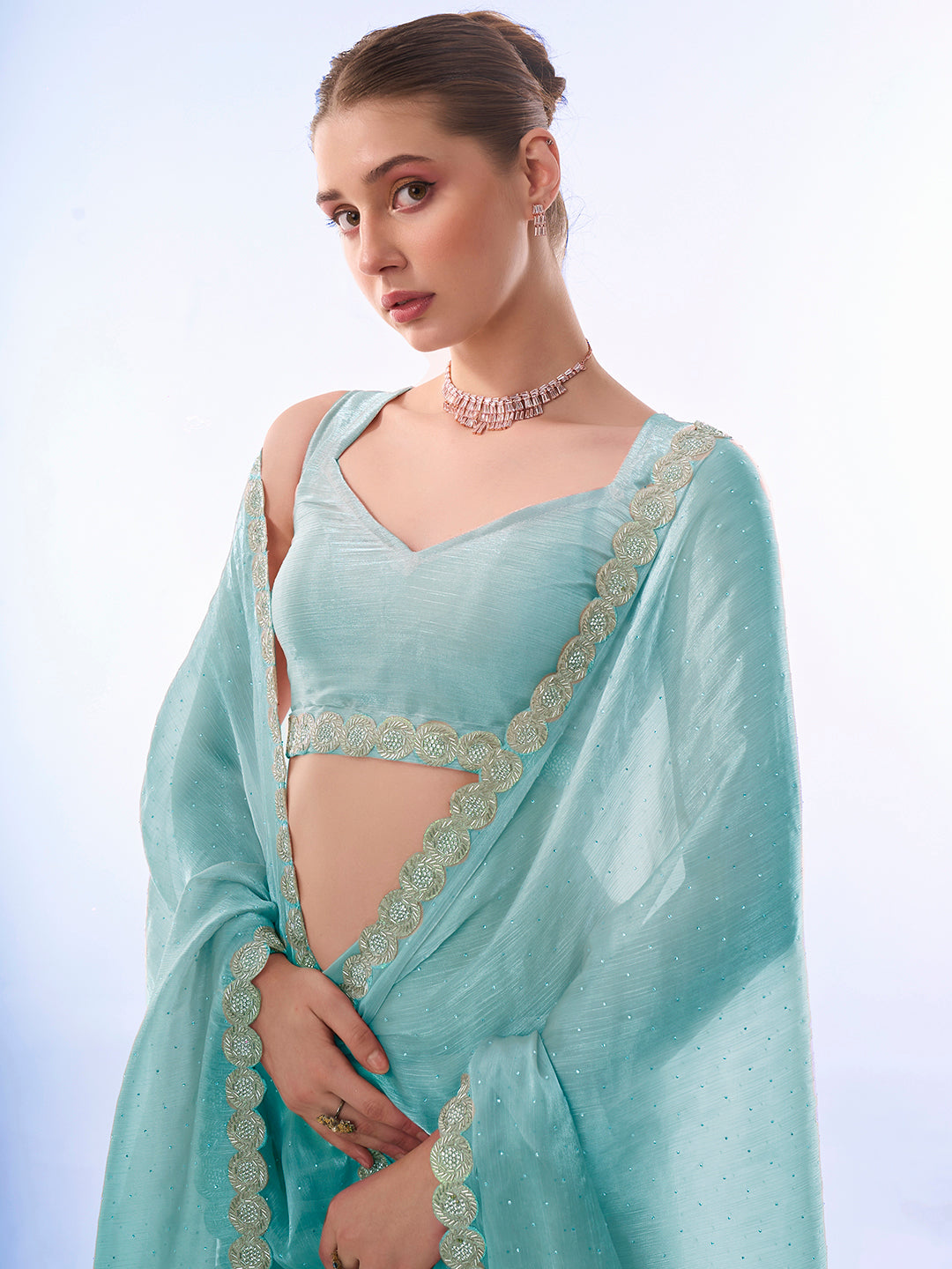 Blue Embellished Beads And Stones Pure Chiffon Saree With Blouse Piece 38918