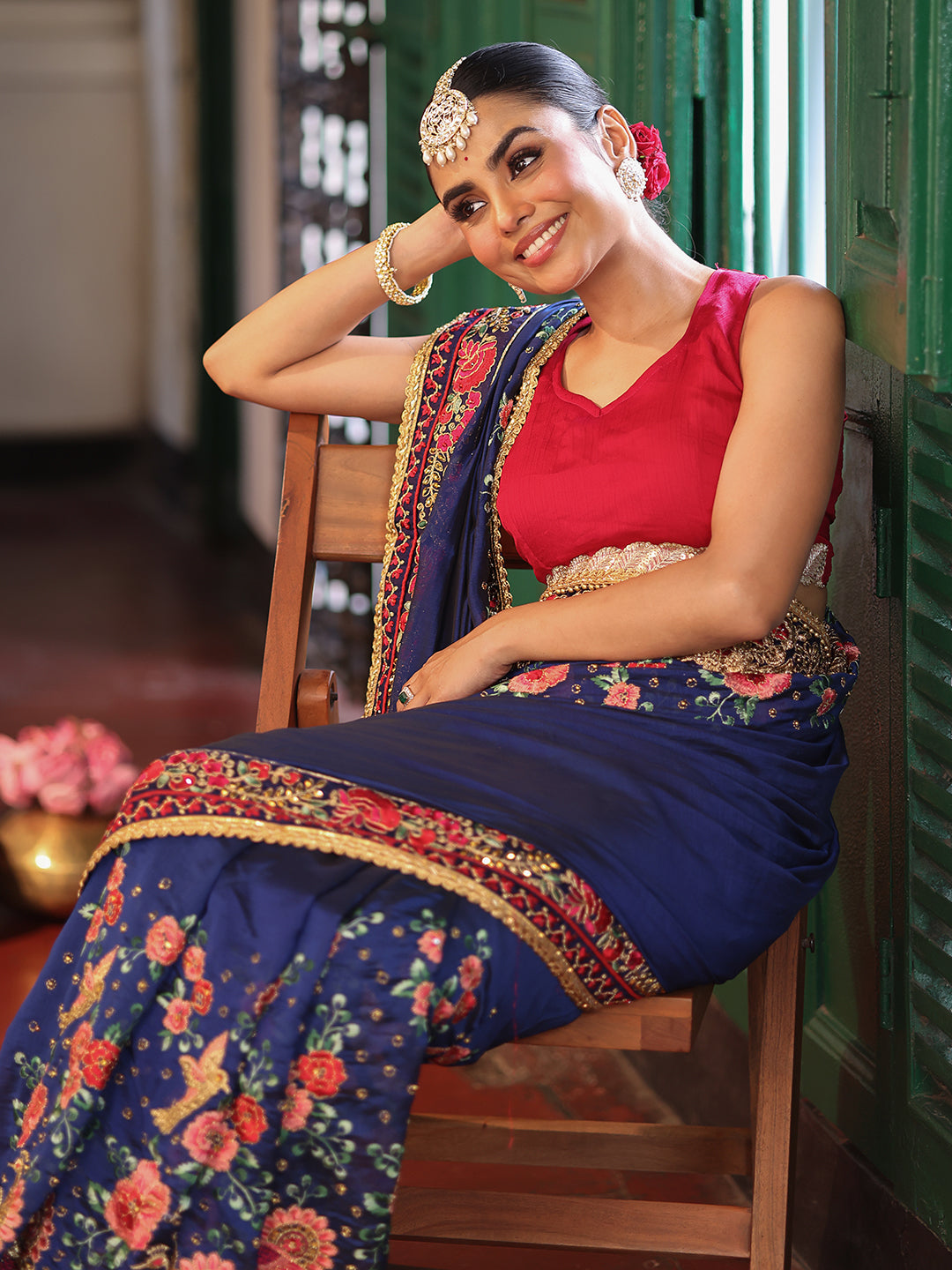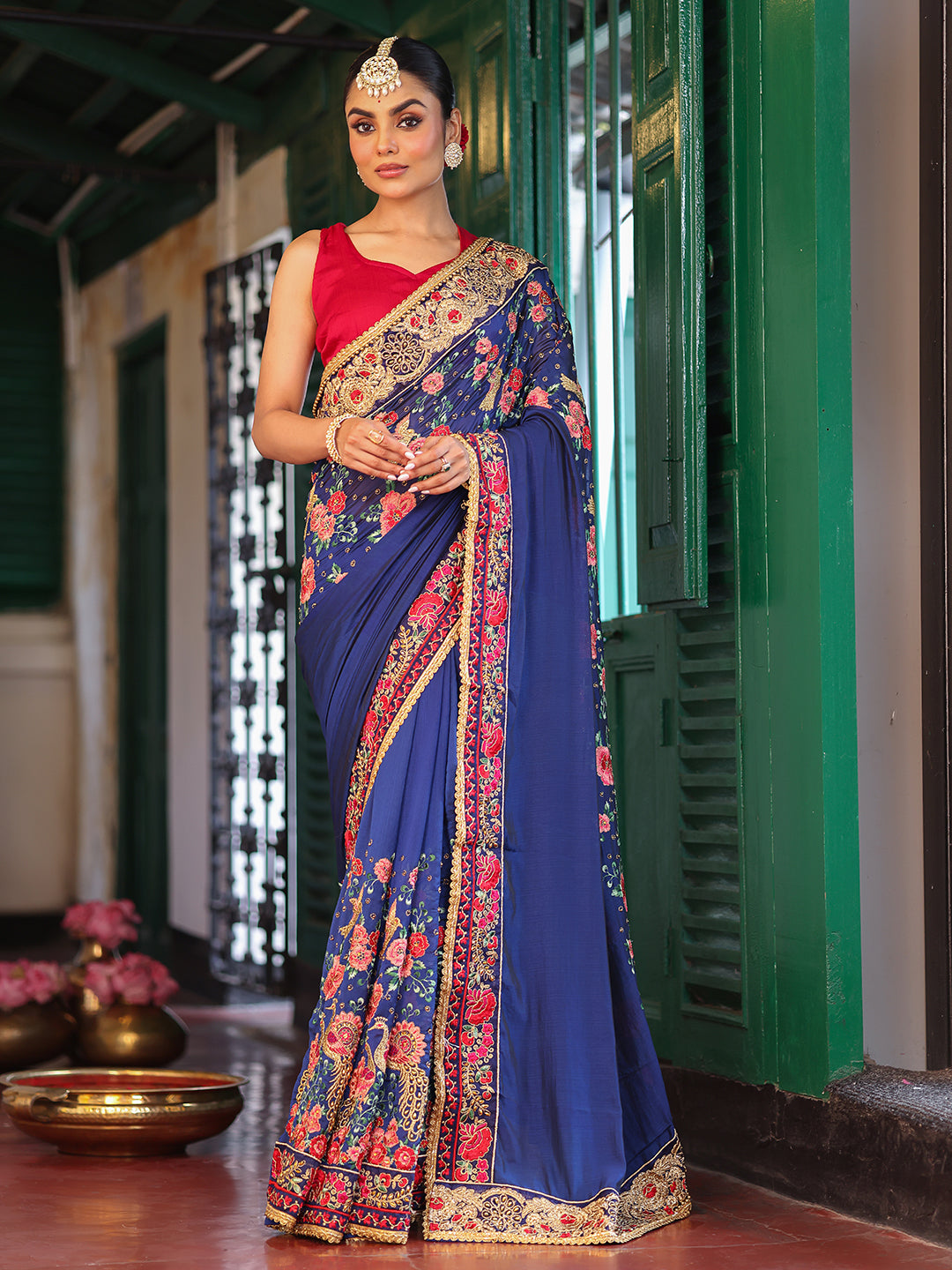 Blue Embroidered Embellished Pure Chiffon Saree 30557
