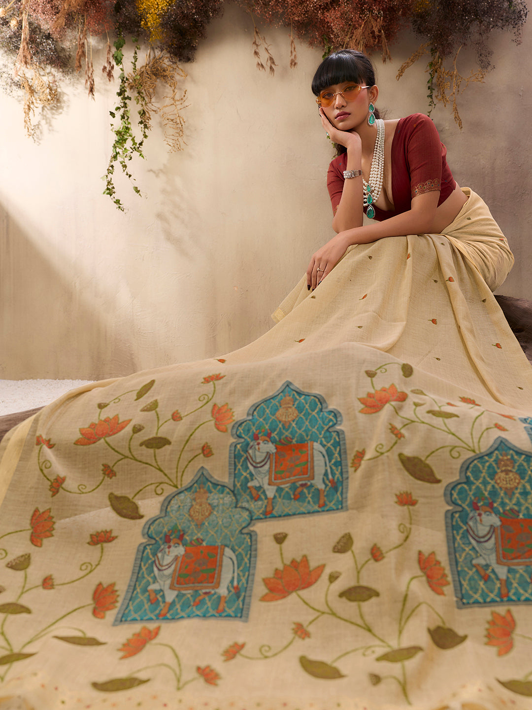 Cream Munga Cotton Handloom Weaving Saree With Blouse Piece 39756
