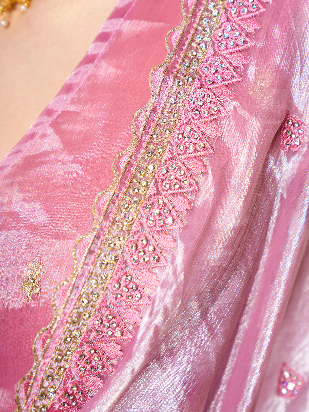 Embroidered Embellished Pink Organza Saree With Blouse Piece 26772