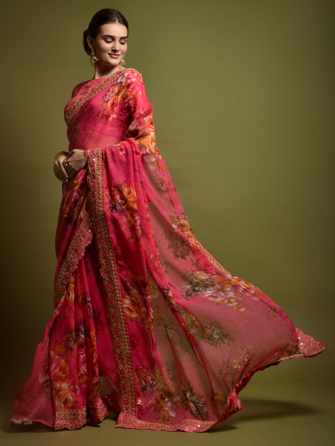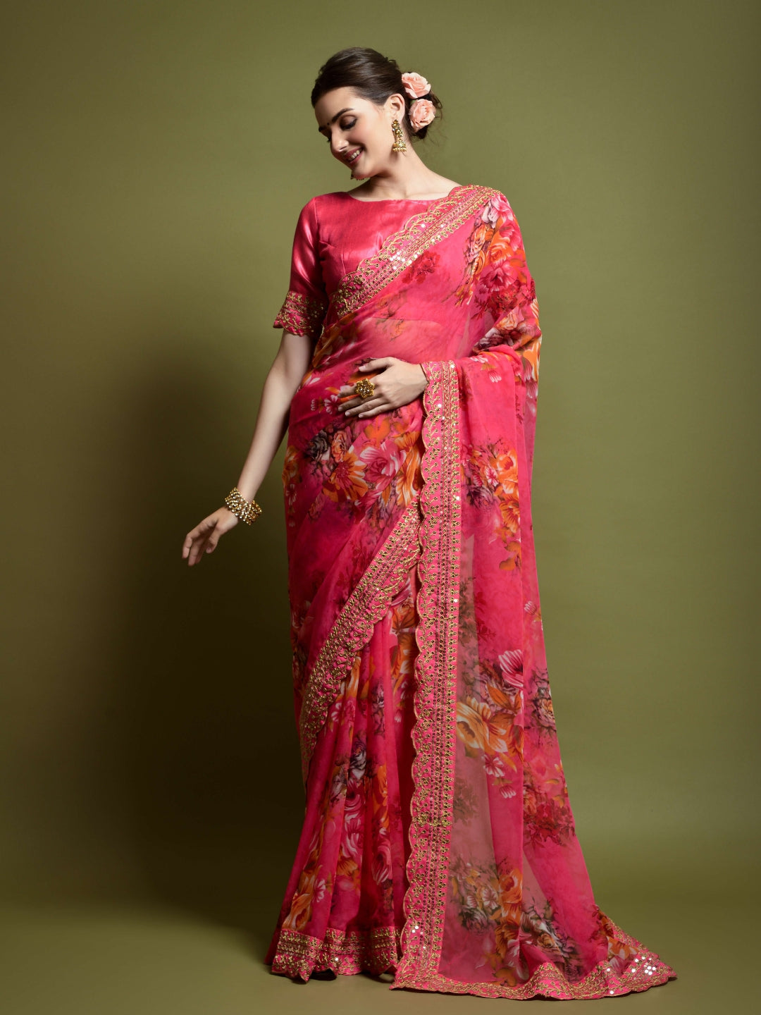 Georgette Chiffon With Flower Print With Embroidered Foil Work Saree 74071