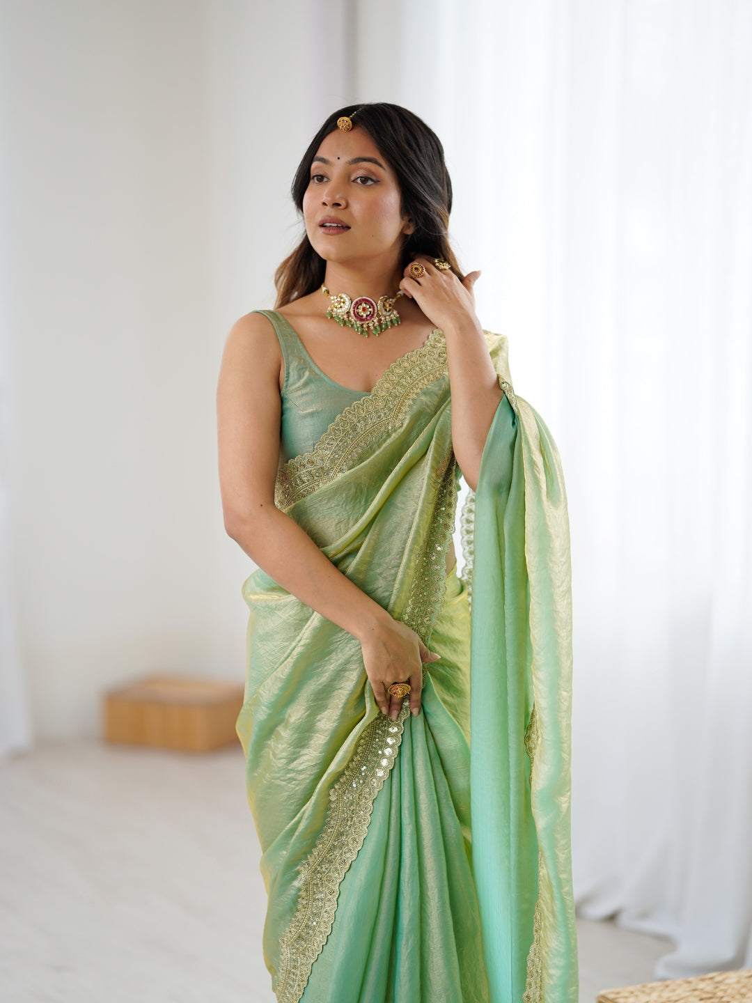 Green Fandy Satin Two Tone Sequins And Zari Work Saree With Blouse Piece 73860