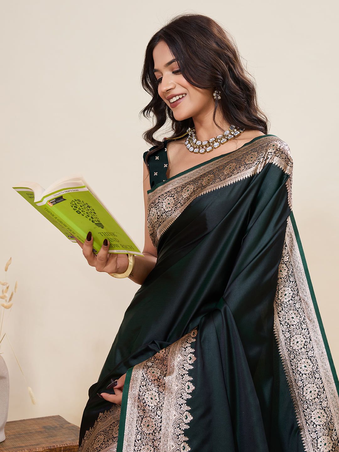 Green Pure Satin Silk Gala Border Concept Weaved With Jari And Minakari Rich Pallu Saree With Blouse Piece 64364