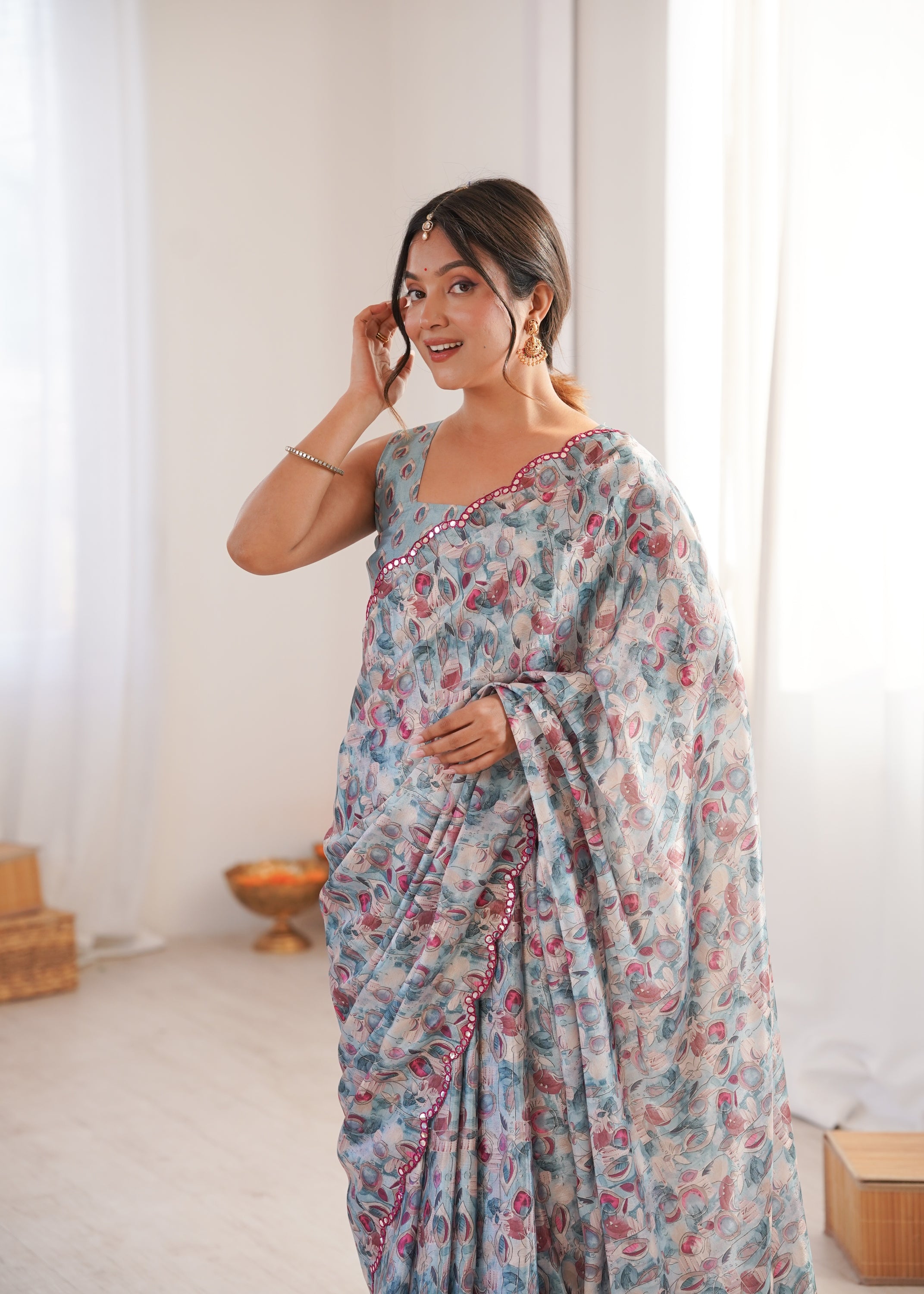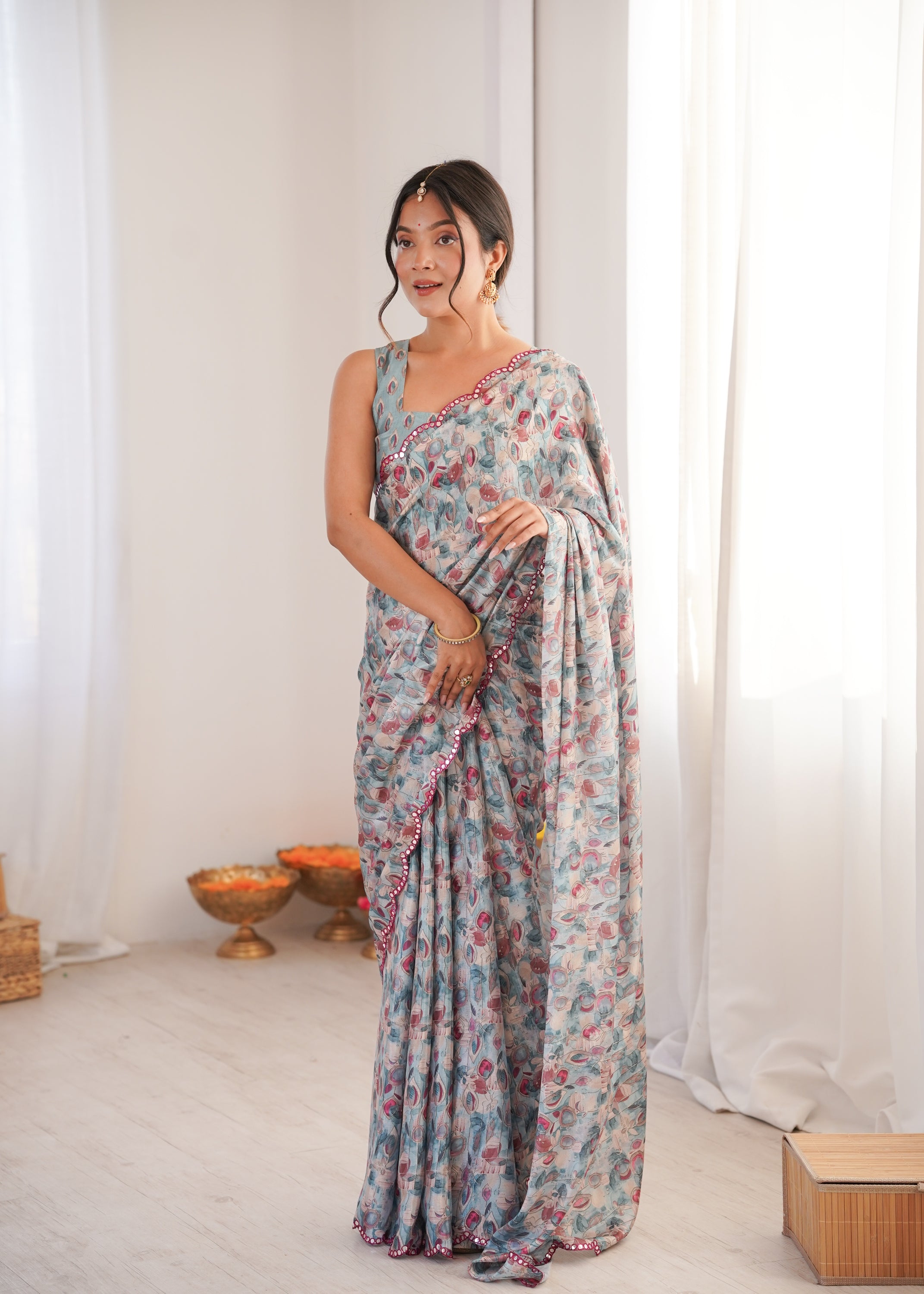 Grey Chinon Digital Printed Designer Saree With Blouse 28778