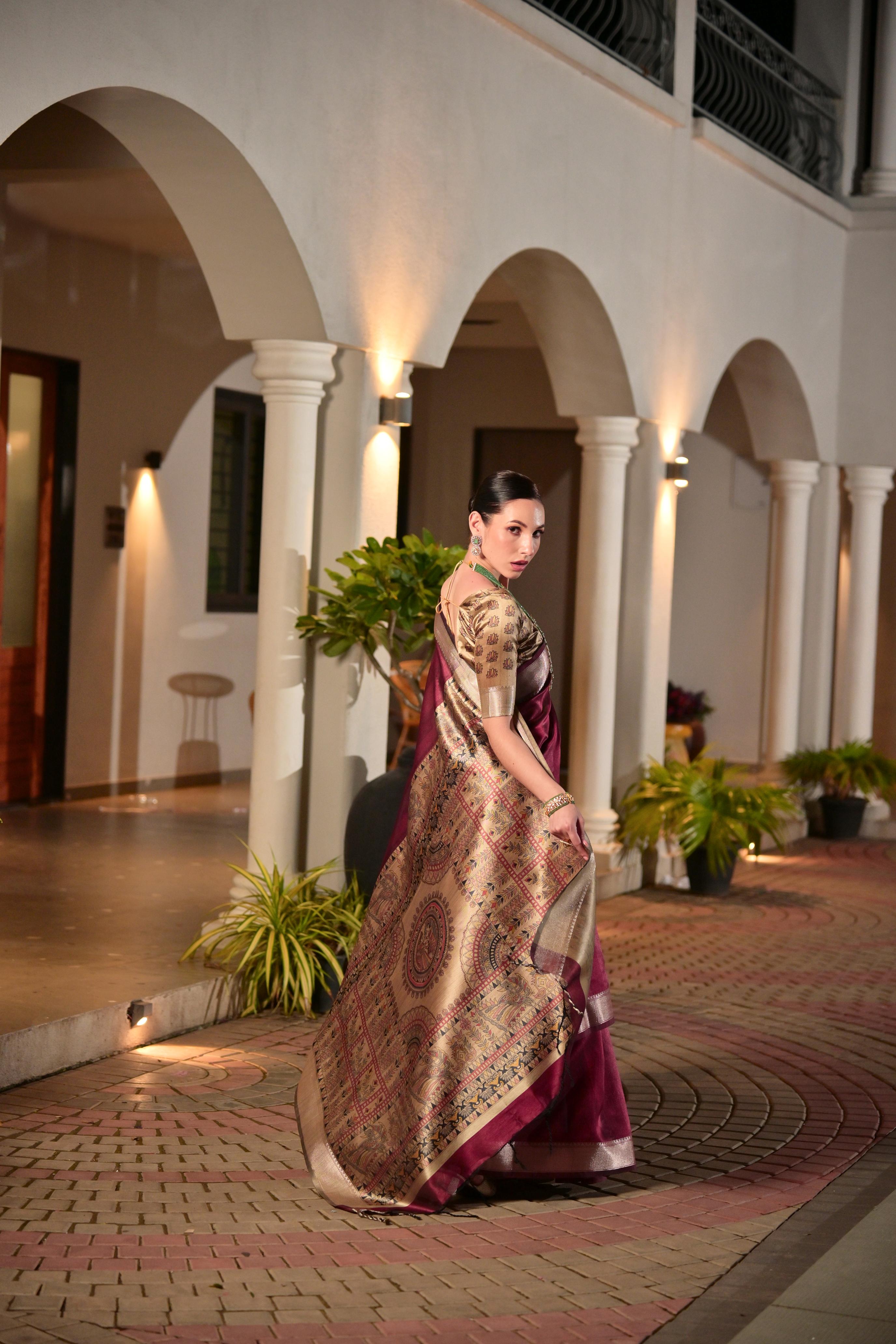 Maroon Soft Khadi Raw Silk Saree With Traditional Hand Painted Madhu Bani Pallu And Zari Weaving Temple Border With Extraordinary Lotus Printed Blouse Piece 78887