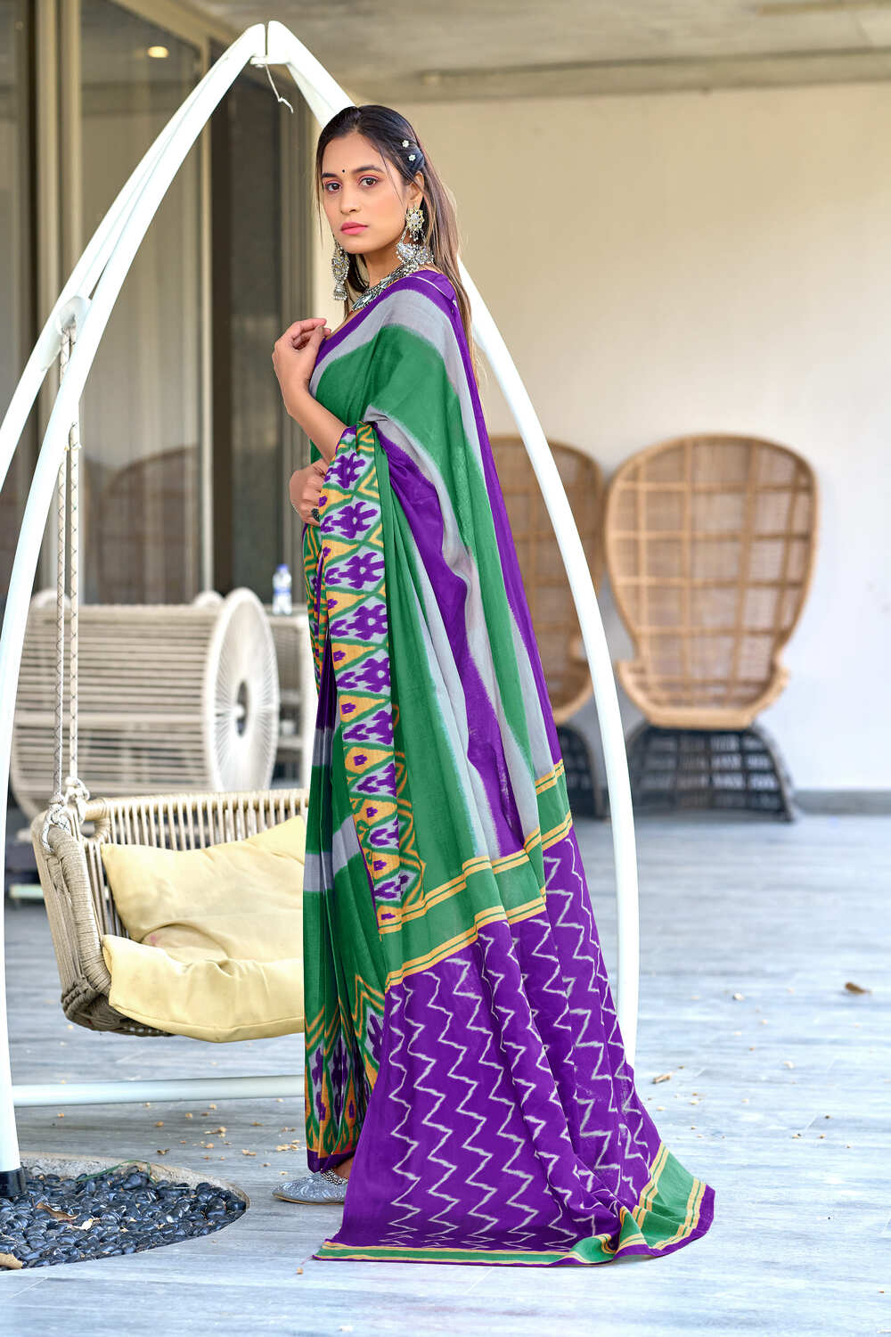 Multi Colour Ikkat Print Mulmul Cotton Sarees Saree With Blouse Piece 13892