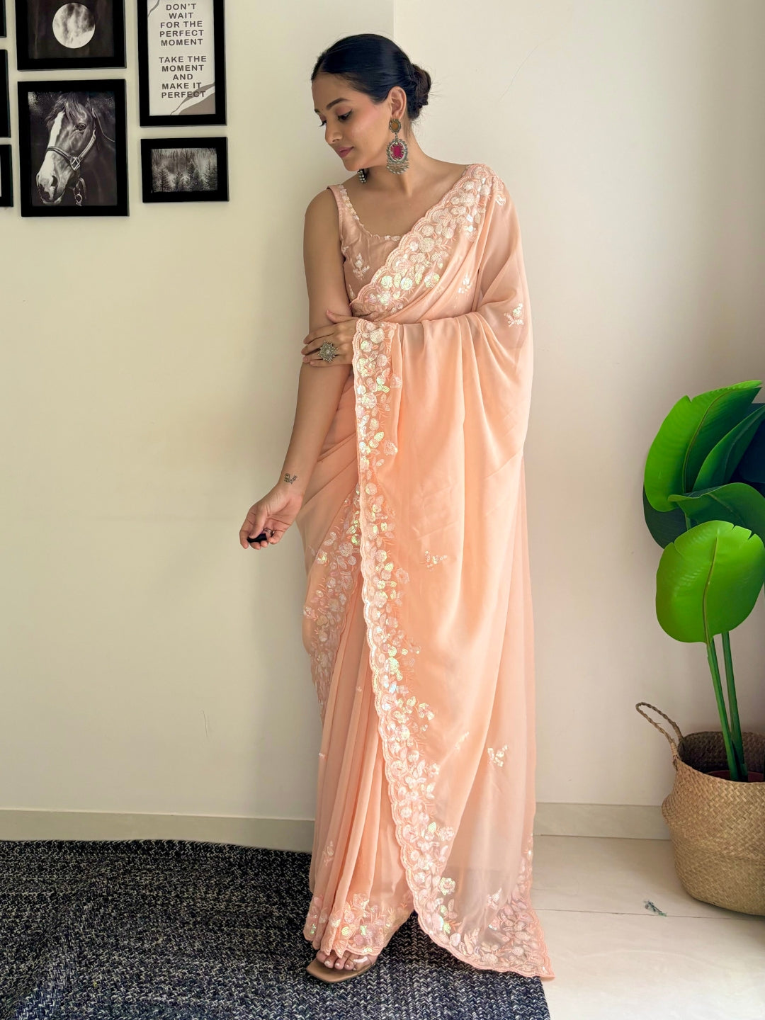 Peach C Pallu Embroidery Seqwance Work With Cut Work Border Saree With Blouse Piece 35979