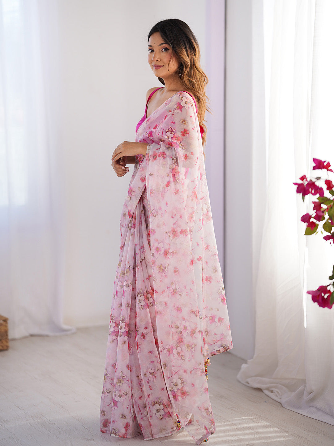 Pink Floral Printed Organza Saree With Blouse Piece 49579